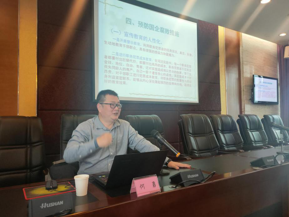 讲座上,何勇以“国有企业预防腐败实践探索”为题,从建国以来反腐败历史的简要回顾、当前国企领域反腐败的形势、水务企业违纪违法典型案例、预防国企腐败措施四个方面,剖析腐败根源,深入浅出地将国有企业预腐防变工作做了详细的梳理和讲解,具有很强的教育性和警示性。公司党委副书记、总经理李涛结合讲座内容,对进一步抓好党风廉政工作提了四点要求:一是要强化政治定力;二是要抓实纪法学习;三是要坚持严于律己;四是要自觉接受监督。李涛强调,讲座的目的在于进一步提高干部职工对党风廉政建设重要性的认识,切实加强廉洁自律教育,将党风廉政建设不断引向深入。